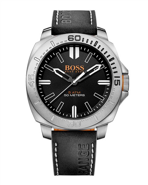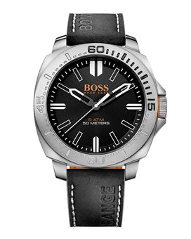 Ένα ρολόι του οίκου Boss και της σειράς Sao Paulo, από ανοξείδωτο ατσάλι και μαύρο δερμάτινο λουράκι.