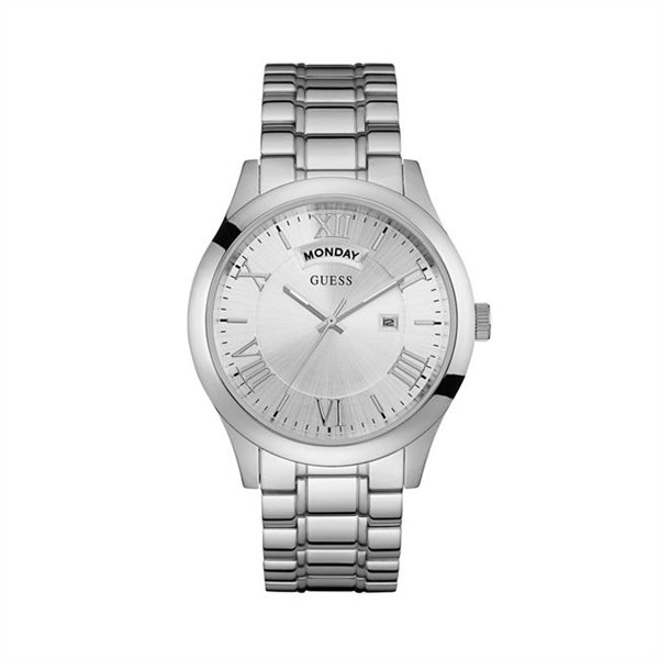 Ανδρικό ρολόι χειρός Guess από ανοξείδωτο ατσάλι με ασημί καντράν και μπρασελέ.