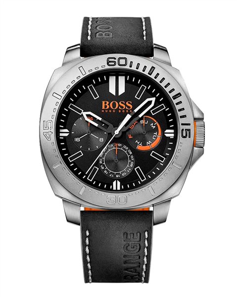 Ένα ρολόι του οίκου Boss από ανοξείδωτο ατσάλι και μαύρο δερμάτινο λουράκι.