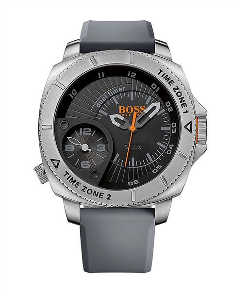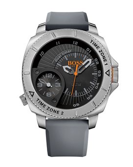 Ένα μοντέρνο ρολόι του οίκου BOSS από ανοξείδωτο ατσάλι και γκρι καουτσούκ λουράκι.