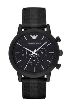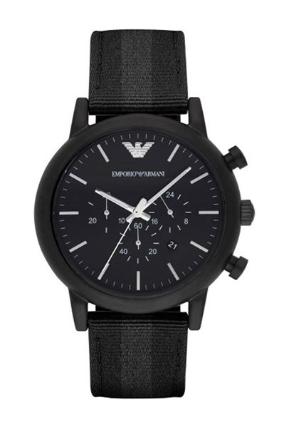 Ρολόι της εταιρίας Emporio Armani με υφασμάτινο λουράκι και ένδειξη ημερομηνίας. Κατάλληλο για άνδρα, ταιριάζει υπέροχα σε αντρικό καρπό