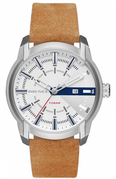 Ανδρικό ρολόι χειρός Diesel από ανοξείδωτο ατσάλι με λευκό καντράν και καφέ δερμάτινο λουράκι.
