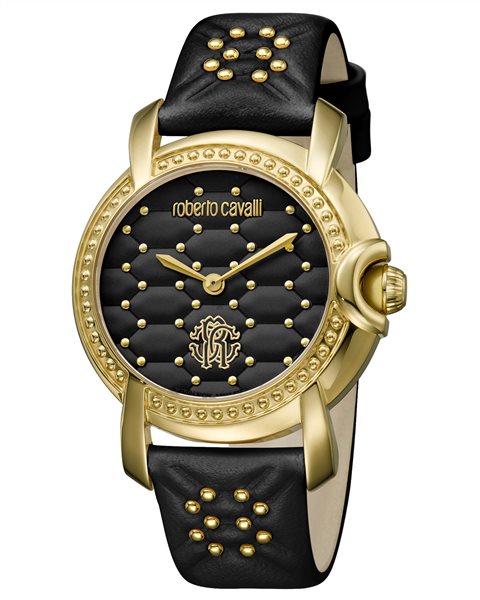 Ένα ωρολόι του οίκου Roberto Cavalli με μαύρο καντράν και μαύρο δερμάτινο λουράκι.