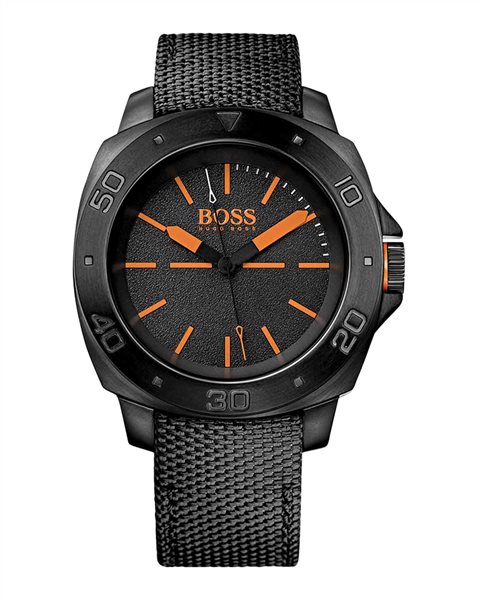 Ενα μοντέρνο ρολόι της Boss Orange απο μαύρο ανοξείδωτο ατσάλι με μαύρο καντράν και μαύρο δερμάτινο λουράκι