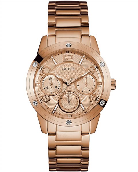 Εντυπωσιακό ρολόι της Guess από ροζ χρυσό ανοξείδωτο ατσάλι με ροζ χρυσό καντράν.