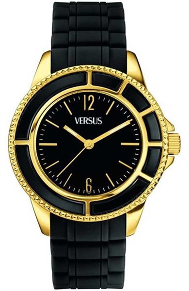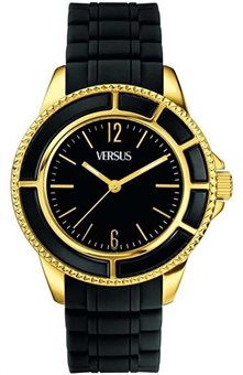 Γυναικείο ρολόι Versus by Versace από επιχρυσωμένο ανοξείδωτο ατσάλι με μαύρο καντράν και μαύρο καουτσούκ λουράκι.