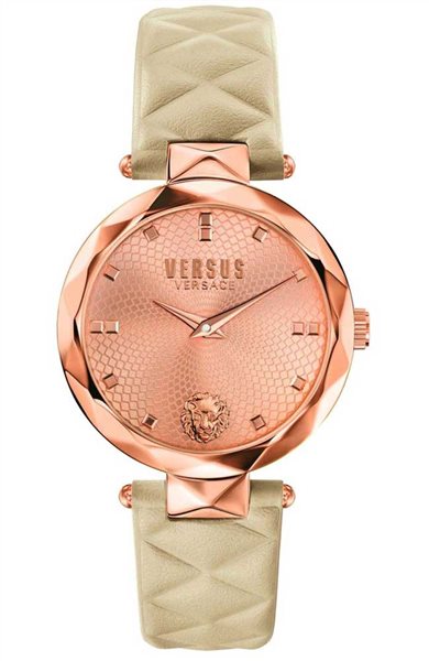 Γυναικείο ρολόι Versus by Versace από ροζ επιχρυσωμένο ανοξείδωτο ατσάλι με ροζ χρυσό καντράν και μπεζ δερμάτινο λουράκι.
