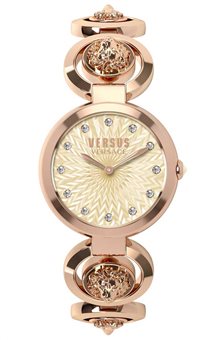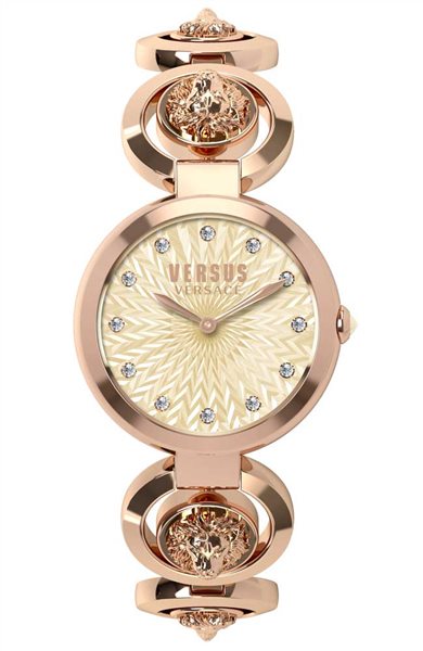 Γυναικείο ρολόι Versus by Versace από ροζ επιχρυσωμένο ανοξείδωτο ατσάλι με μπεζ καντράν, πέτρες ζιργκόν και μπρασελέ.