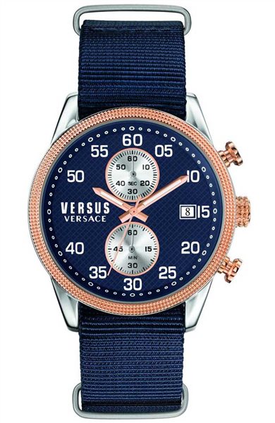 Ανδρικό ρολόι Versus by Versace από ανοξείδωτο ατσάλι με μπλε καντράν και μπλε υφασμάτινο λουράκι.