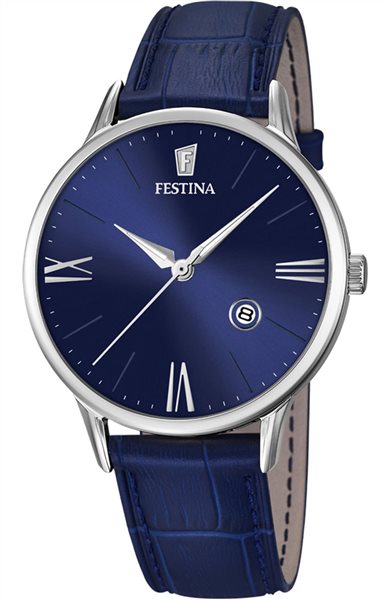Ανδρικό ρολόι Festina από ανοξείδωτο ατσάλι με μπλε καντράν και μπλε δερμάτινο λουράκι.