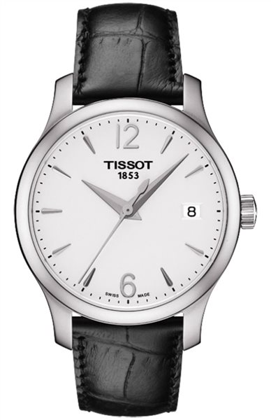 Γυναικείο Ρολόι χειρός Tissot Ελβετικής κατασκευής από ανοξείδωτο ατσάλι με λευκό καντράν και μαύρο δερμάτινο λουράκι.