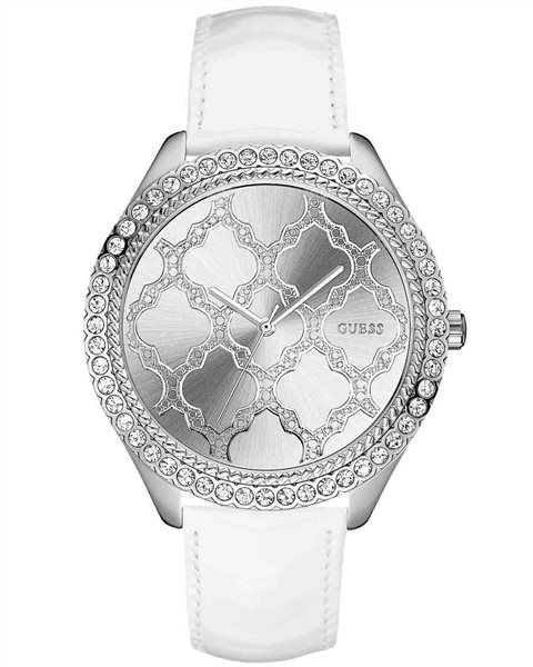 Εντυπωσιακό ρολόι της Guess από ανοξείδωτο ατσάλι, ασημί καντράν και λευκό δερμάτινο λουράκι.
