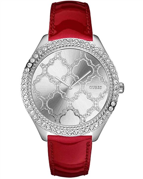 Εντυπωσιακό ρολόι της Guess από ανοξείδωτο ατσάλι, ασημί καντράν και κόκκινο δερμάτινο λουράκι. -