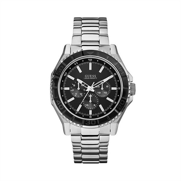 Αντρικό ρολόι GUESS W0479G1 διαμέτρου 44mm, με μηχανισμό QUARTZ Multi-Function ακριβείας, μαύρο καντράν, κάσα – μπρασελέ από ανοξείδωτο ατσάλι.