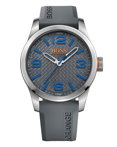 Ένα μοντέρνο ανδρικό ρολόι από τον οίκο Boss και την σειρά Paris, από ανοξείδωτο ατσάλι με γκρι καντράν και γκρι καουτσούκ λουράκι.