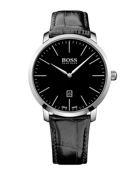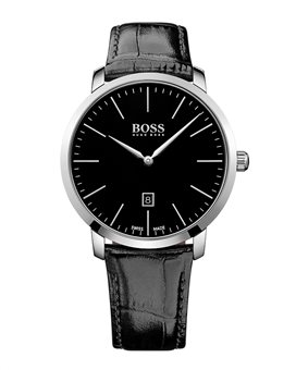 Ένα ρολόι του οίκου Boss και της σειράς Signature, από ανοξείδωτο ατσάλι και μαύρο δερμάτινο λουράκι.